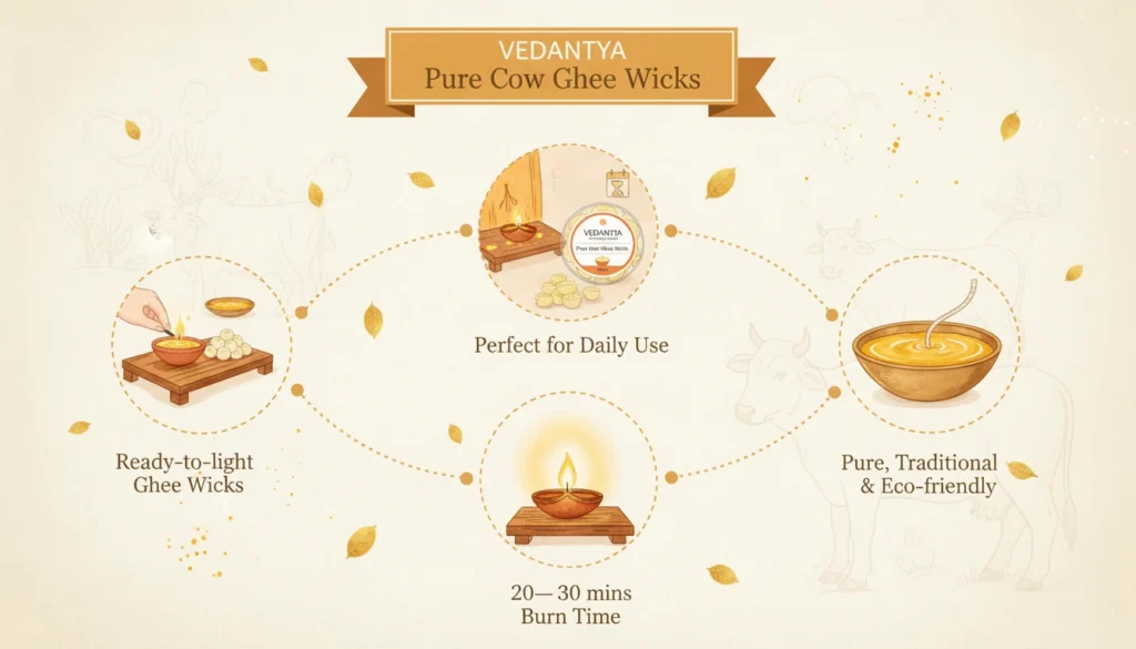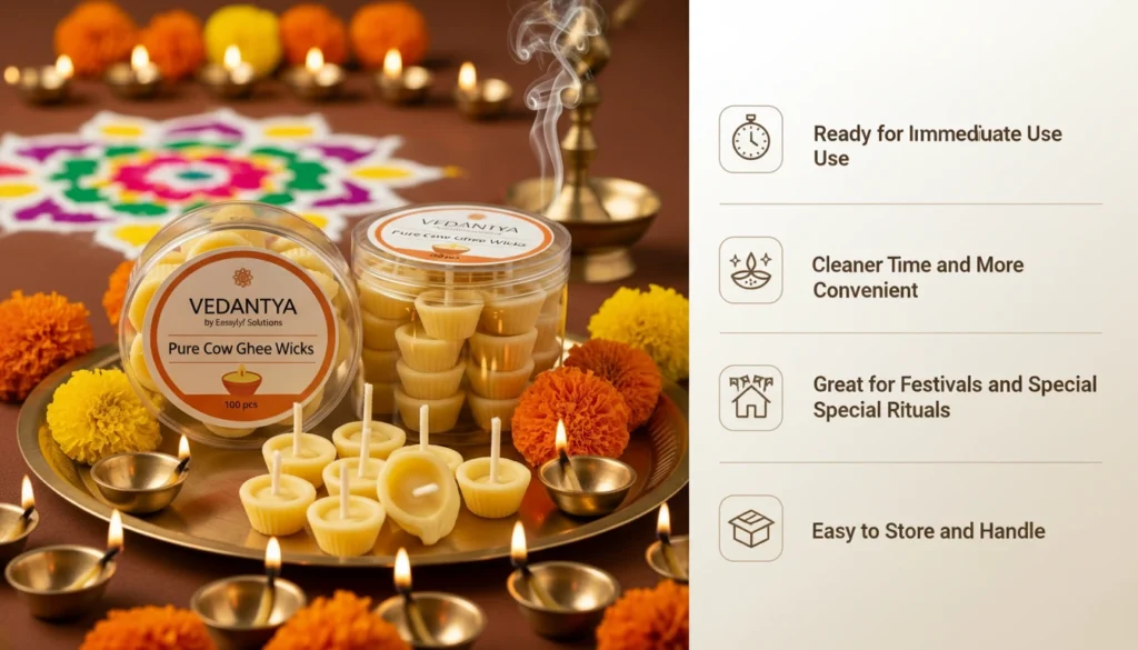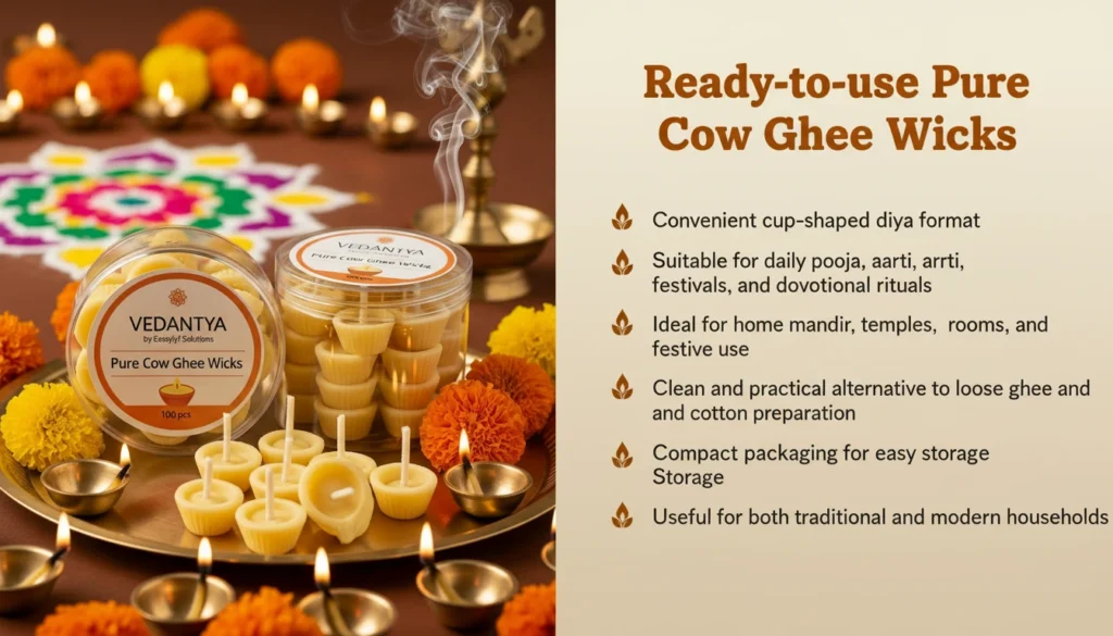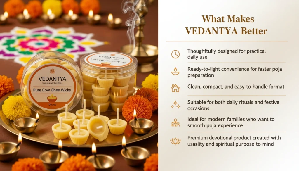 Whether you are performing morning pooja, evening aarti, Diwali diya lighting, Navratri rituals, Lakshmi pooja, or any auspicious spiritual practice, VEDANTYA helps you maintain a pure and organized worship experience without the mess of preparing loose cotton and ghee separately.